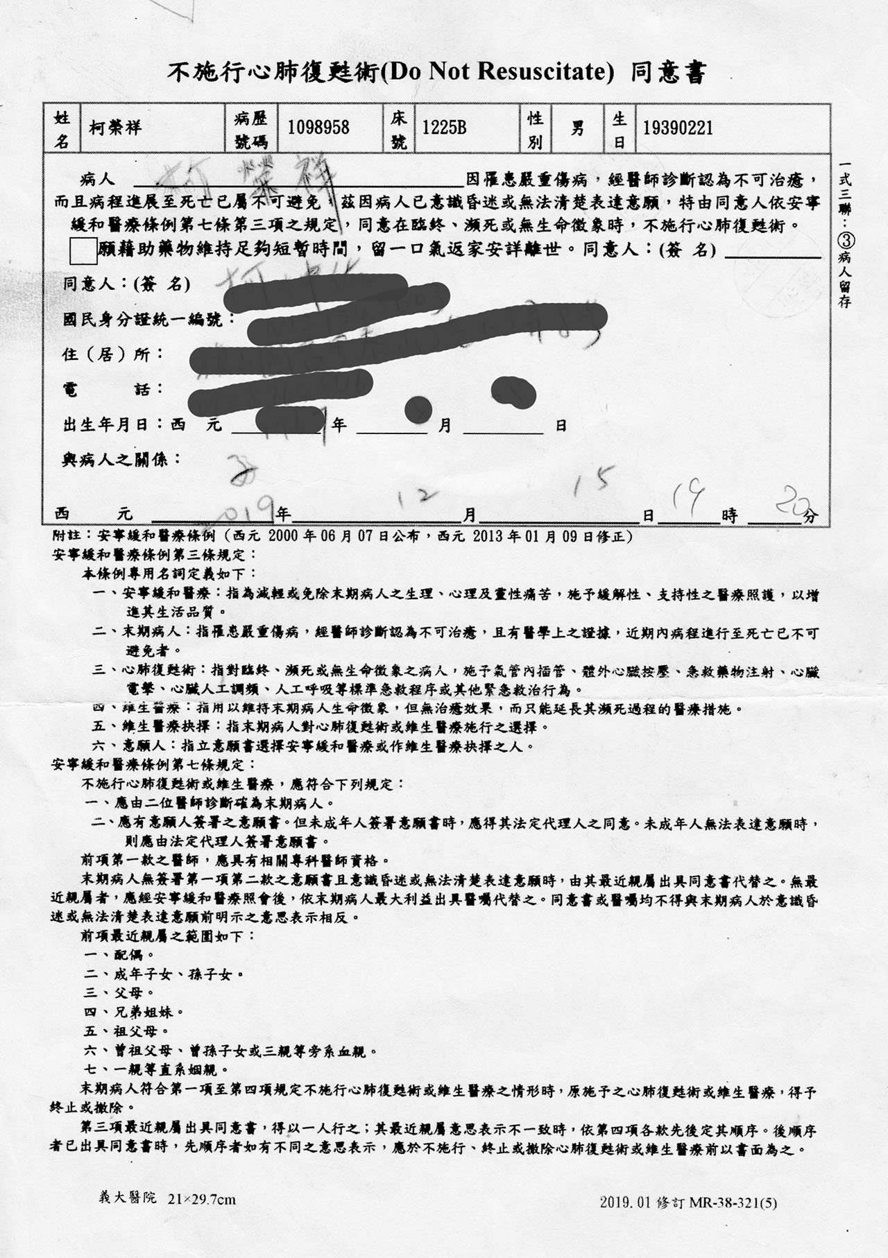 有圖有真相,站長父親在2019年12月9日因長期肺炎又轉惡化,送進高雄義大醫院搶救,醫師們用盡各種方法救治,12月15日晚間醫生們宣佈放棄,勸我趁一息尚存送回老家(在'彰化),我告訴醫生不用送,在醫院自然走(後事)就行了,因為家人都事先來看過了。於是醫生就叫我簽下面這張(放棄搶救)同意書,我簽了,醫生們也都離開了。