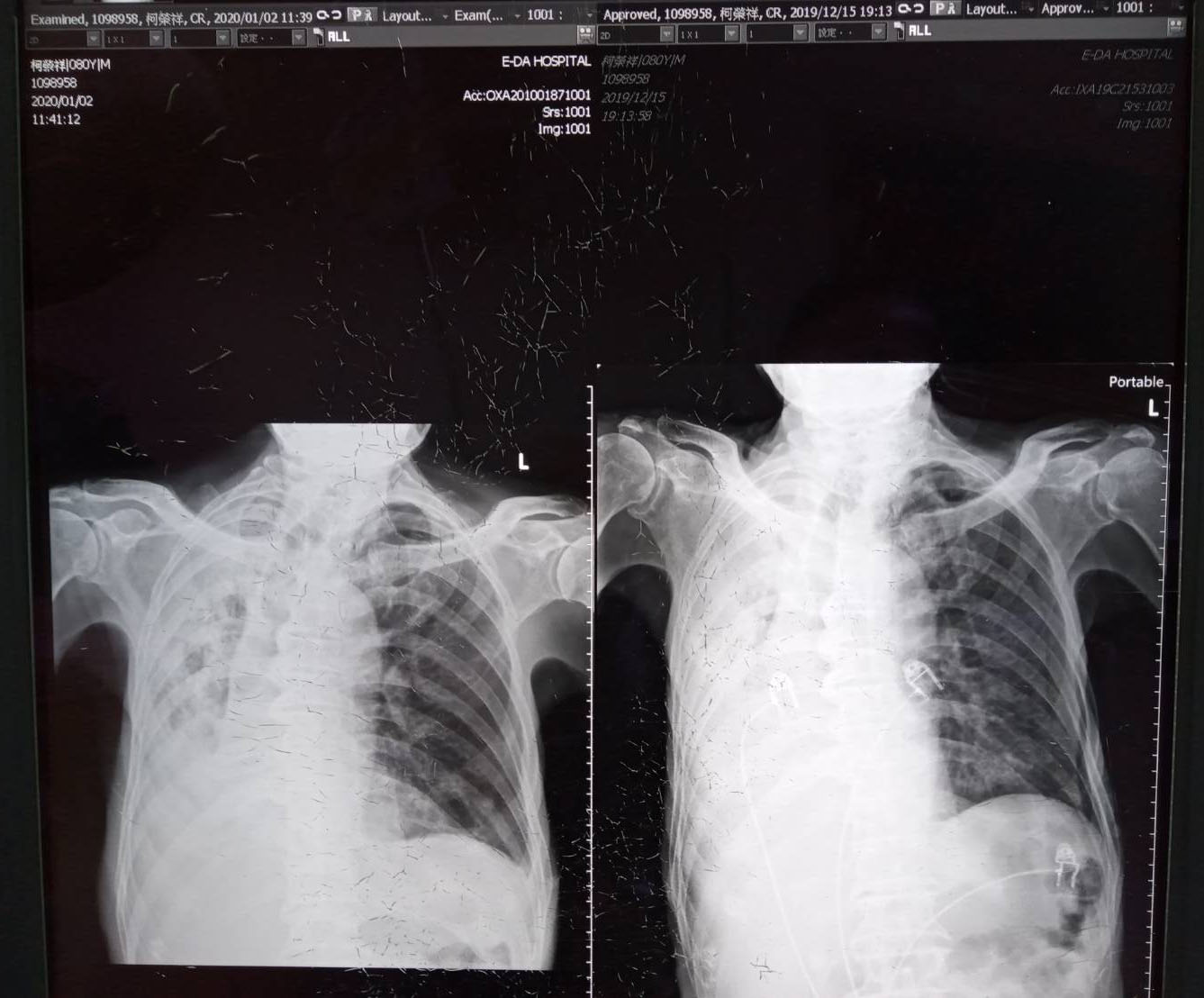 隔天起來,父親仍在。我知道師父幫了一個大忙。父親不但沒走,還一天一天好起來,醫生都覺的驚奇,到12月27日,醫生還宣佈父親可以出院。實在是太神奇了,醫生叫我一月二日回診。回診那天,又照了X光,我請醫生把兩張X光照片併起來拍,醫生同意,拍給了我,右邊是生死存亡的那天(2019.12.15),左邊是回診那天拍的(2020.1.2),可以發現左肺有明顯改善。