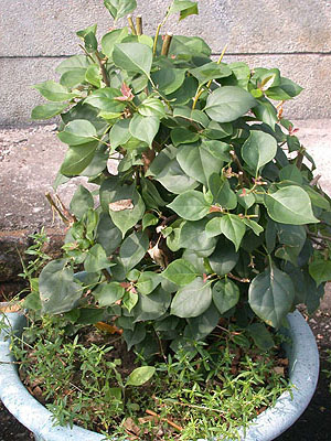 九重葛 科名:紫茉莉科 九重葛是常綠蔓性灌木,枝條未伸長時成灌木,可修剪成庭園、綠籬或盆栽。枝條伸長後成為蔓性植物可作花廊、花牆、蔓籬、蔭棚美化。九重葛品種極多,原種、栽培種、雜交種多達百餘種。枝條具毛或刺,葉有心形、卵形,先端尖,全緣或波狀緣。花頂生或腋出,常為三朵簇生於苞葉內,花冠管狀,細小。重瓣品種,花呈退化狀。花期因品種而異,全年均能見花(花苞),但大多數品種集中於10~3月 ,花彩有單瓣或重瓣,花苞有紅、粉紅、橙紅、橙黃、白、紫、紫紅或單苞雙色。繁殖方法:單瓣品種用扦插或高壓,重瓣及變色品種用高壓或嫁接法,春至夏季為適期。嫁接帖木通常採用生長強勢之光葉九重葛:嫁接雙包品種,接必須選擇具有雙色花苞的枝條作接稱,才能綻開變色花苞,若用紅色或白色單色花的枝條作接稱,嫁接成功後仍然只開單色花。栽植方法以砂質壤土為佳,排水需良好,日照要充足,日照不足生育弱不易開花。通常盆栽比露地栽培容易開花。盆栽每花期過後,將枝條剪短,並補給三要素肥料,比例增加磷、鉀肥,充分補給水分。春季需換盆換土,修剪根部、枝條,才能促使枝條新生開花。若露地栽培生育旺盛而不花,應停止施用氮肥,將徒長枝剪除,再剪除部份細根,使植株稍枯萎,並減少灌水,恢復之後,即能開花。開花期間應避免淋雨或減少水分供給,保持乾燥而葉片不枯萎的程度,花苞才能持久不脫落。性喜高溫、耐旱,忌土壤積水潮濕,生育適溫約攝氏20~32度。