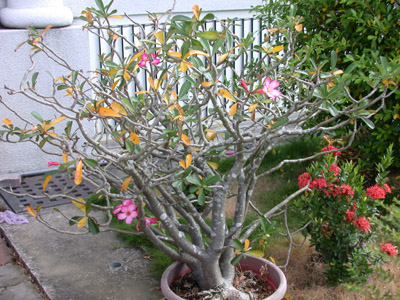 科名:夾竹桃科 別名:天寶花、矮性雞蛋花。 株高約20∼80公分,枝幹肥厚多肉,狀似蒼古老樹。葉簇生,葉正面濃緣,背面淺緣。花頂生,聚繖花序,漏斗形,五瓣有桃紅色、深紅、粉紅、或粉白色,花期春制秋季。老幹基部肥大而蟠曲,甚具觀賞價值。分枝頗多,枝葉肥厚而其豐沛乳汁。葉片倒披針形或長橢圓形,先端近於乎截狀而有小突尖。4∼10月間開花,花序叢集於枝端,花冠漏斗狀,當繁花錦簇時,每每全無葉片。花蕊隱藏在冠喉中;果實為長尖角狀蓇葖果,種子多數,有柔毛協助飛行散佈。花朵盛開時幾不見葉,都適用在盆栽上。全株有毒,乳汁毒性較強。