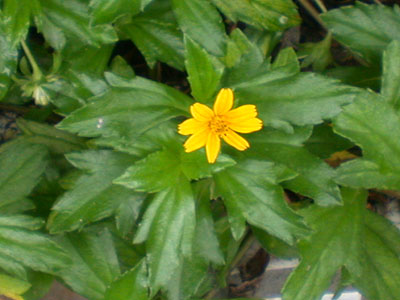 植物名:南美蟛蜞菊 【回旗山植物圖鑑】【回旗山奇首頁】 科名:菊科 別名:地錦花、穿地龍 多年生草本,莖枝伸長呈蔓性,葉三叉掌狀或三裂披針形,對生,鋸齒緣,葉面光澤,葉背有細毛,花鮮黃,終年有花,夏至秋季盛開,生性強健,耐旱又耐濕。