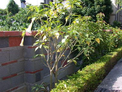 植物名:曼陀羅 【回旗山植物圖鑑】【回旗山奇首頁】 科名:茄科 別名: 大花蔓陀羅株高2∼4公尺。葉互生,卵狀長橢圓形,全緣,葉面粗糙,有毛。春季開花,腋生,碩大而下垂,花冠喇叭狀,白色,有如優雅的白紗折裙禮服,並具淡淡芳香,適合庭園露地栽培。全株有毒,不可誤食,其汁液含生物鹼,可入藥作鎮定劑、麻醉劑;本種原產於巴西,本省1910年引進後以馴化,在陽明山、溪頭、谷關等地呈野生狀態。