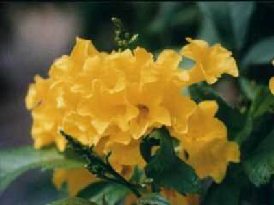 植物名:黃鐘花 【回旗山植物圖鑑】【回旗山奇首頁】 科名:紫葳科 別名: 常綠灌木,株高1~2m,葉對生,奇數羽狀複葉少有單葉。花為黃色,頂生喇叭狀,花冠漏斗狀鐘形,花萼為茼狀鐘形五淺裂。果為蒴果線狀,種子狹橢圓形,具有薄大的二翼。以播種、扦插來繁植,春秋為適期。以播種為佳,土壤排水需良好,富有機質,以砂質土壤為佳。栽培方法:喜性濕潤、陽光充足。主要花期夏季、秋季。每花期過後即將上部枝條剪除,可繼續抽枝開花。 生活習性:樹性強健,耐寒,耐高燥,性喜濕潤。常做為庭園樹、盆栽;可供觀賞。