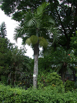 植物名:棍棒椰子 【回旗山植物圖鑑】【回旗山奇首頁】 科名:棕櫚科 別名: 單幹,莖表面有明顯葉痕及花序遺痕;株型似小株的大王椰子,惟大王椰子幼株不會開花,無花序遺痕。幹上部略澎大,似棍棒,故名,羽狀複葉,小葉劍形,肉穗花穗,易開花,漿果長橢圓形。用途:小型行道樹,庭園綠化用。